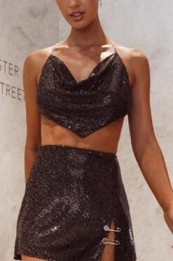 Jaws will drop when you strut by in our super hot Aleigh crop top. We are obsessed with its open back and chain straps. Perfect for a glam girls’ night out at your fave rooftop bar. Team it with platform heels and its matching mini skirt for a look that will turn heads.