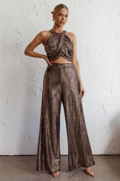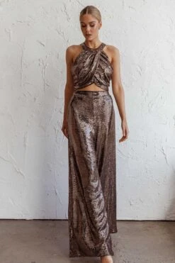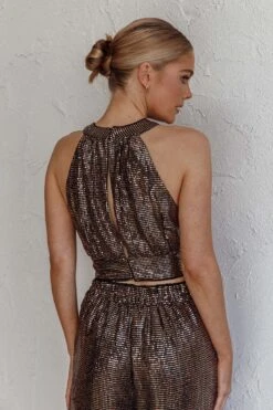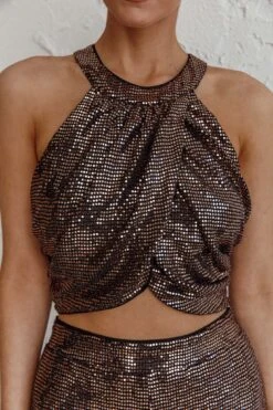 Light up the night in our hot Anything Goes crop top. Featuring a draped look in the front and glitzy, sequin fabric. It’s perfect for a girls’ night out teamed with our Anything Goes pants and metallic heels.