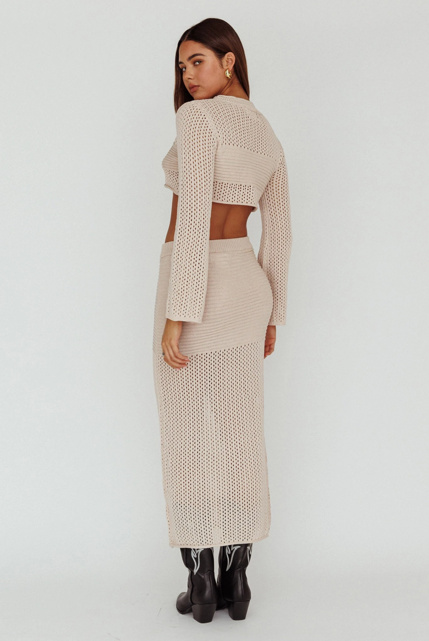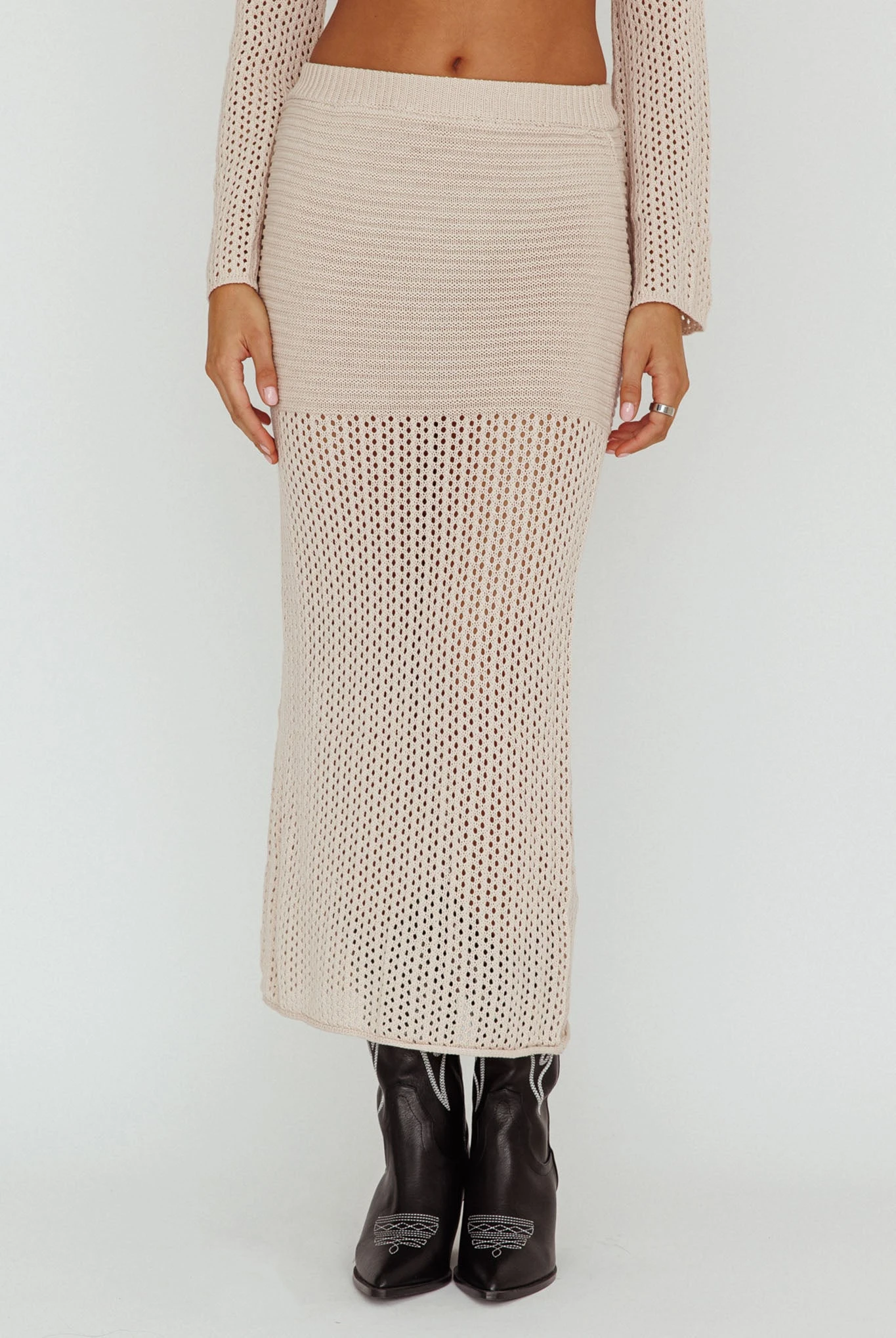 - Beige, knit midi skirt