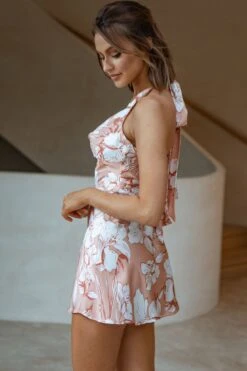- Peach hibiscus print mini dress
