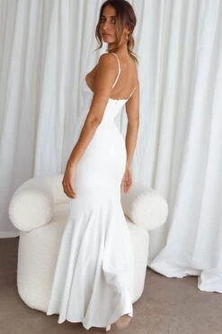 Jaws will drop when you walk in the room wearing our gorgeous Darlene dress. We are in love with its elegant silhouette featuring a pretty flounce hem and front split. Perfect for the modern bride or prom queen. Team it with strappy, nude heels and clutch.