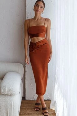 Jaws will drop when you walk by in our Desert Nights crop top. We are majorly crushing on that silky fabric and tie-up back. Perfect for romantic date nights teamed with its matching midi skirt and perspex mules.