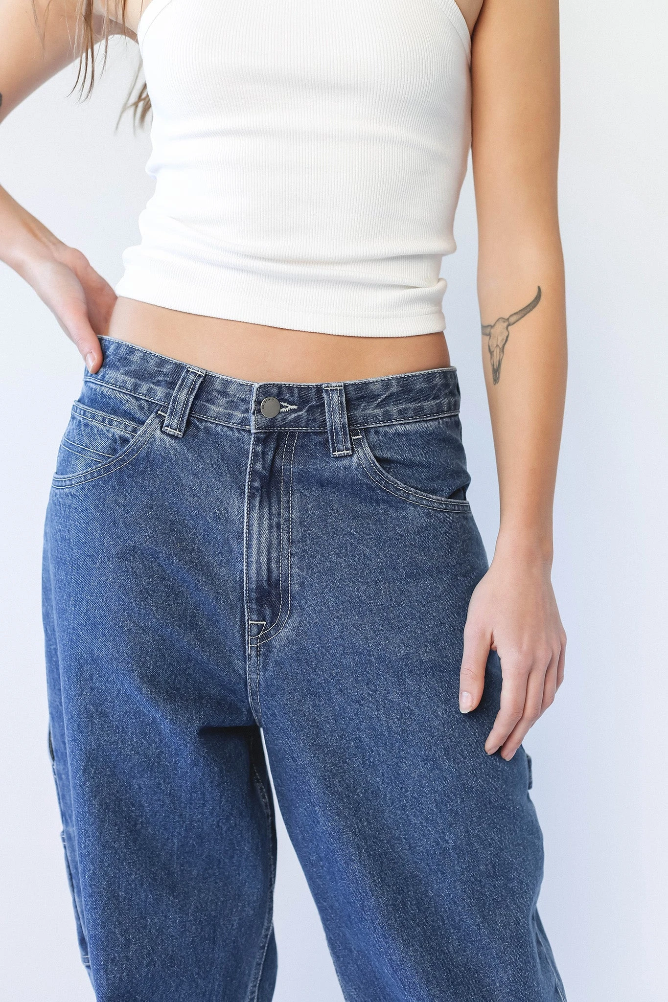 The newest style to our Women’s Denim. Meet the Faye Worker in Pebble Mid Stone, designed for a slouchy, baggy fit that sits low on the hips, much like pairs from the ’90s. Perfect for the upcoming festival or running the day to day errands, pair her with a basic crop or oversized tee. With a wide leg that slightly tapers at the hem. Featuring workwear detailing, made to sit on the hips with the crotch dropped low. Sized up to wear them super low, or size down to wear them higher on the waist.