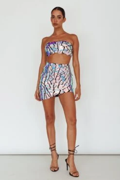 Light up the room in our super hot El Camino mini skirt. We are obsessed with its iridescent, mosaic embellishment! Perfect for a special occasion or birthday celebration. Team it with its matching top and black, platform heels for an unforgettable look.
