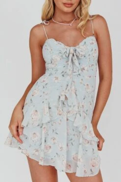 Flower Child Bust Tie Ruffle Trim Dress Rose Print Blue