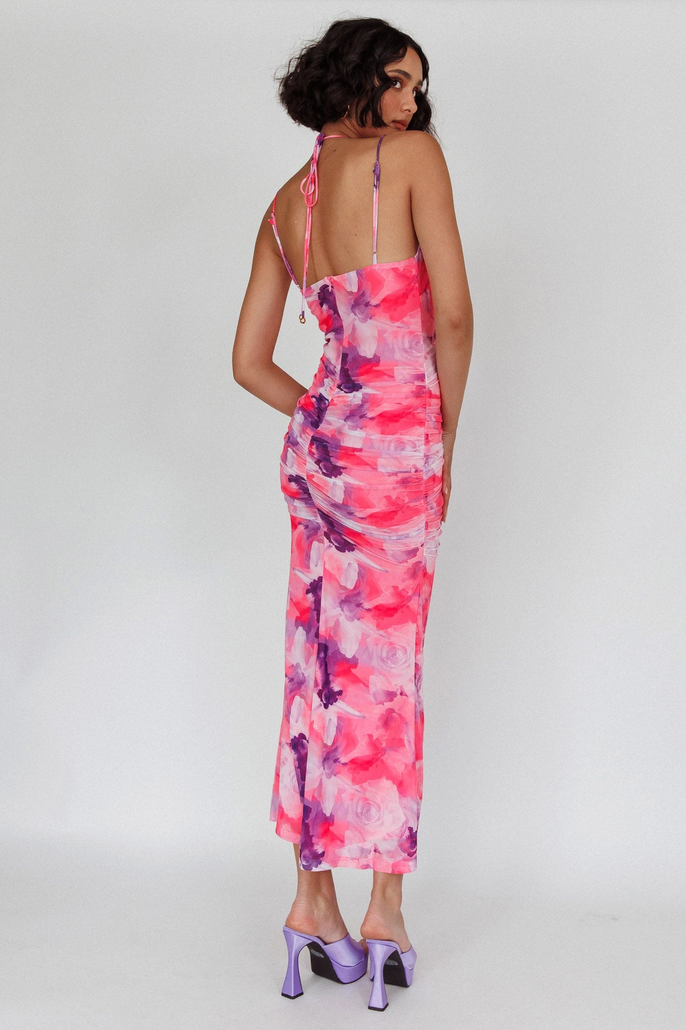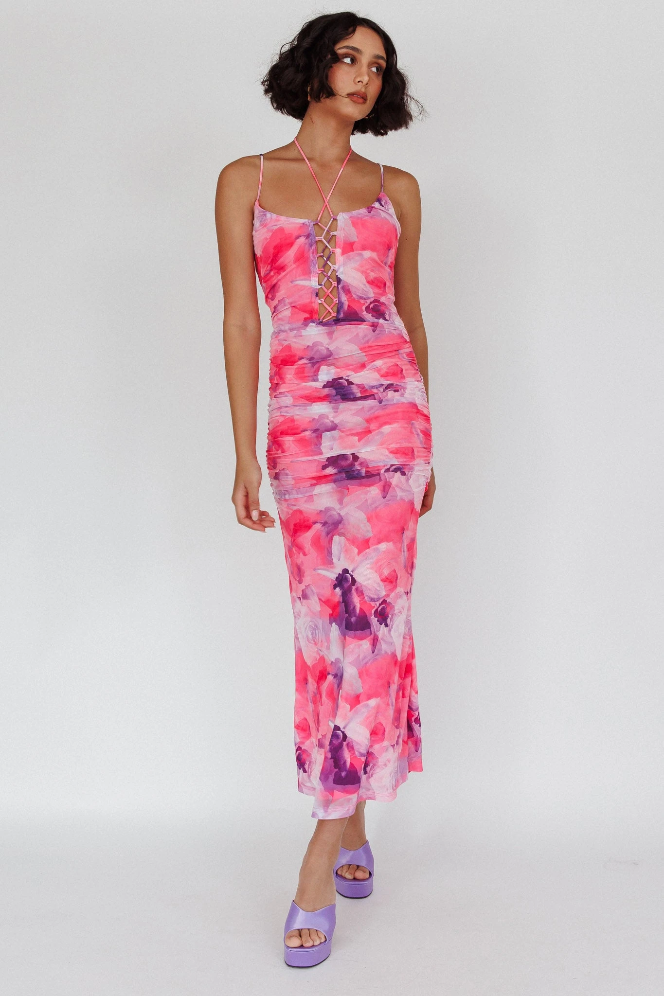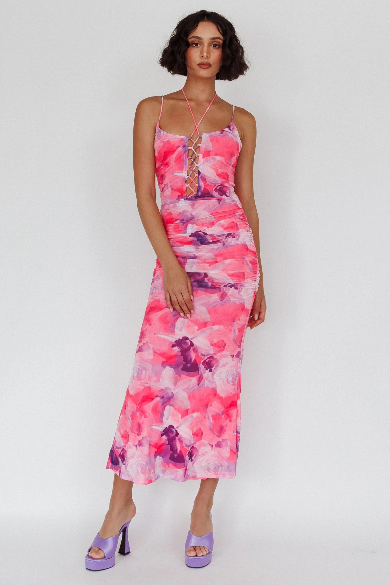 Steal the spotlight in our pretty Gypsy Garden midi dress. Featuring ruched sides and a lace-up feature in the bodice. It’s perfect for a girls’ night out teamed with platform mules and a purse.