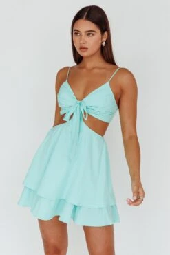 Turn heads in our super cute Jeneva mini dress. Featuring a tied bust and cut-out waist. It’s perfect for a girls’ night out or date night teamed with a purse and kitten heels.
