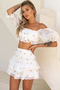 Ohhkay cutie, we see you! Jaws will drop when you strut by in our gorgeous Krista skirt. Obviously, we are obsessed with those pompoms! And you know we love a ruffle hem! Team it with its matching crop top for a look that’ll have you flooded with compliments.
