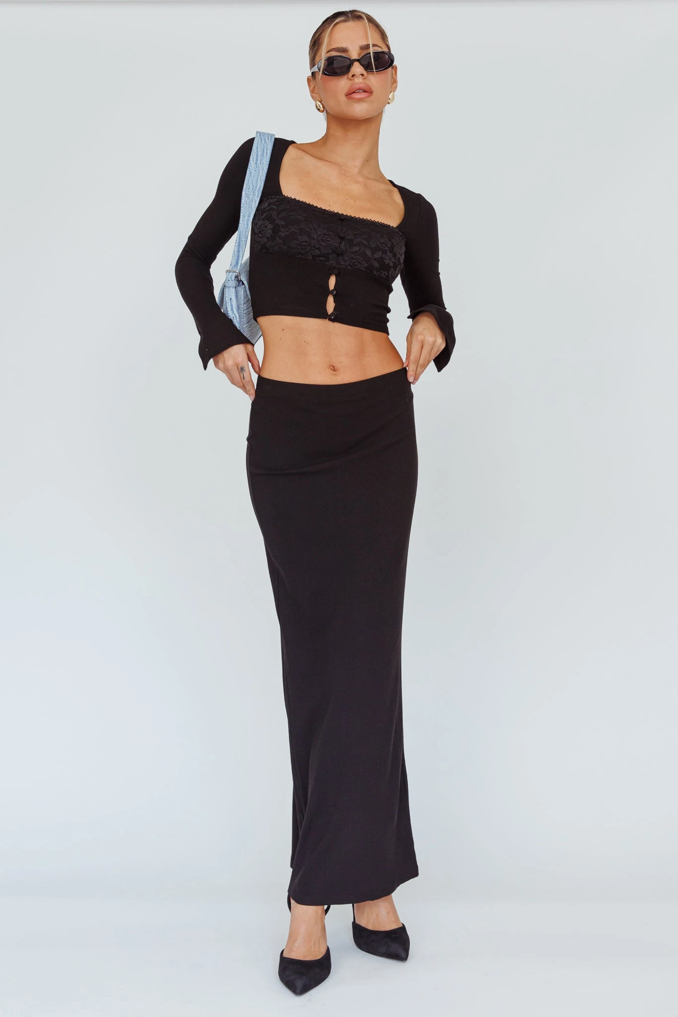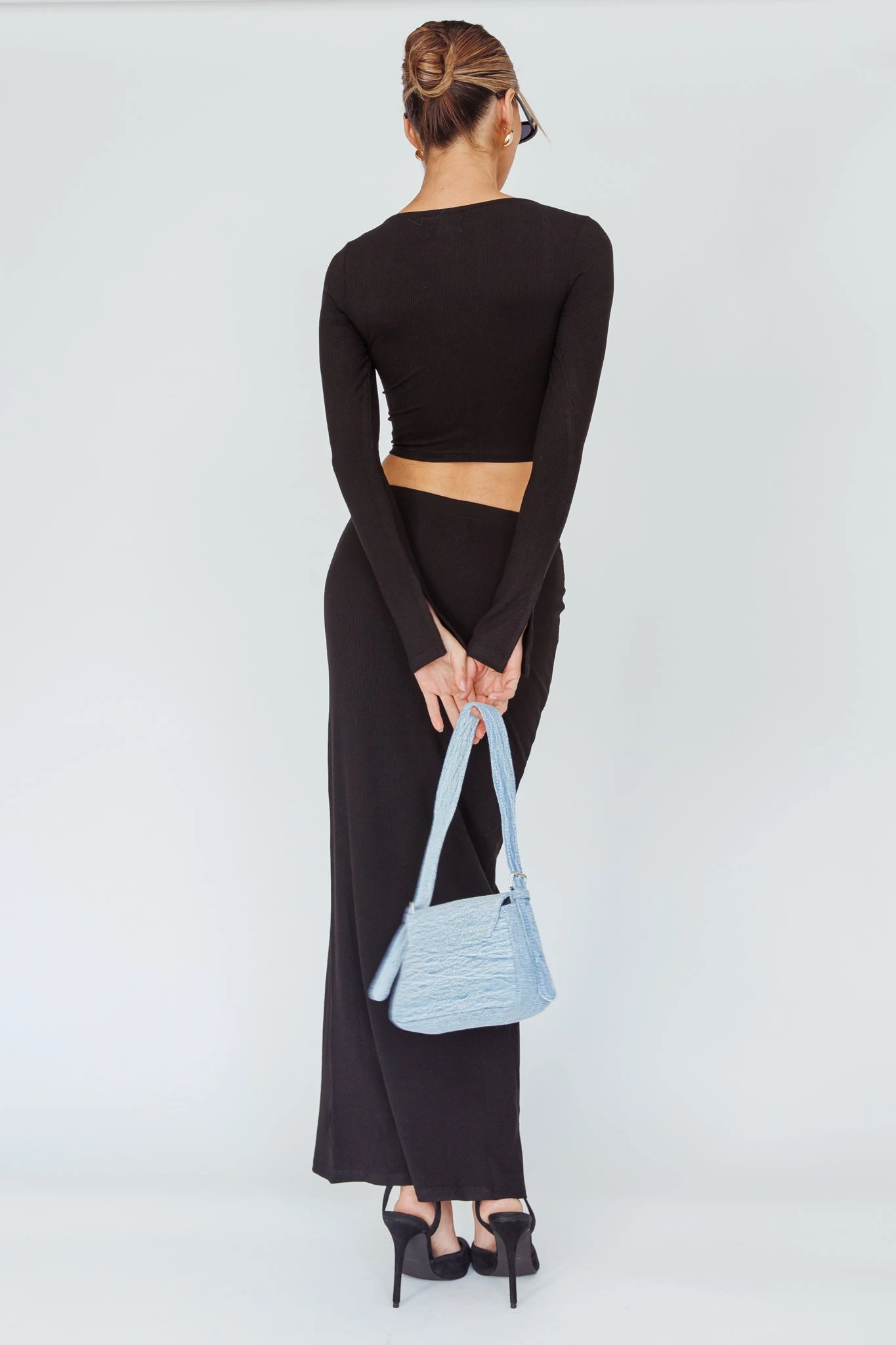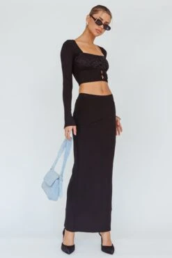 Steal the show in our super cute Lauryn maxi skirt. We are loving the stretchy fabric that hugs your curves. Perfect for a girls’ night out teamed with its matching crop top, gold hoops and mules.