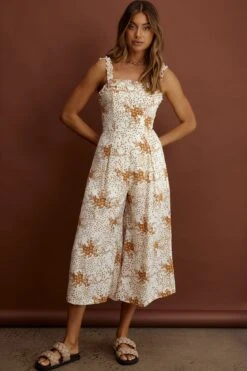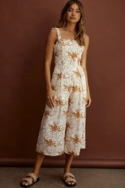 - Tan, floral jumpsuit