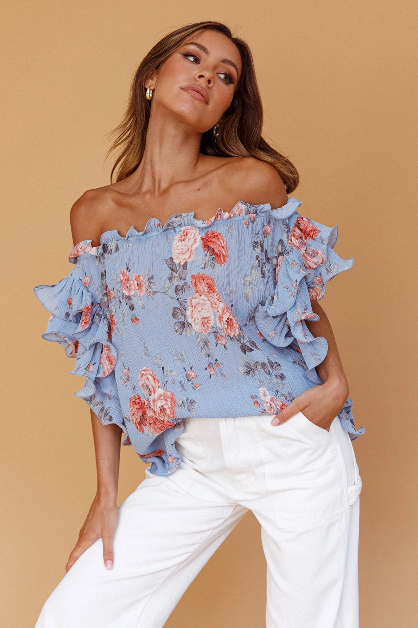 Hey there, cutie! You’ll be floating through your day in our super cute Miranda top. We are obsessed with its ruffle trim details and relaxed style. Perfect for lazy weekends strolling the farmers’ markets. Team it with denim shorts and western boots for a chic look we are loving.