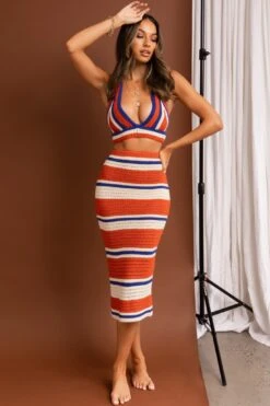 We are obsessing over our super hot Mojave midi skirt. Featuring a striped knit, it’s giving us all the boho vibes. Perfect for desert road trips with your girls teamed with its matching crop top, a cowgirl hat and western boots. Yee haw!
