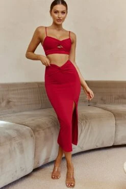 You’ll be unforgettable in our hot One Night Only midi skirt. Featuring a twist detail in the waist and sexy, thigh-high split. It’s perfect for dinner dates with your beau or a glitzy girls’ night out teamed with its matching crop top.