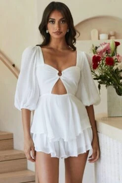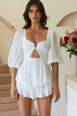 Breeze through your day in our pretty Picture This romper. Featuring 3/4 balloon sleeves and a cut-out feature with in the bust. Perfect for weekend brunching with your besties, it looks amazing with tan mules and a straw tote.