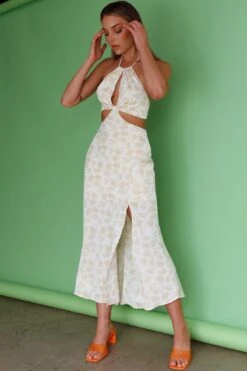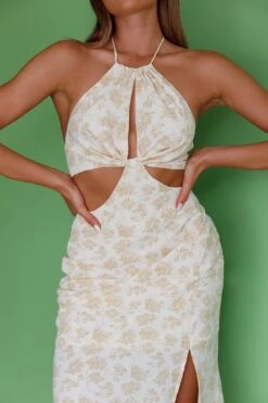 Make an entrance in our gorgeous Rising Sun midi dress. Featuring a cut-out bodice and sexy front split. Perfect for a flirty date with your lover or weekend brunching with your girls. Team it with strappy heels and a small purse for a look we are loving.