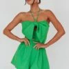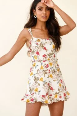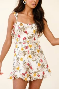 Stand By Me Frill Trim Tied Back Romper Botanic Print Beige
