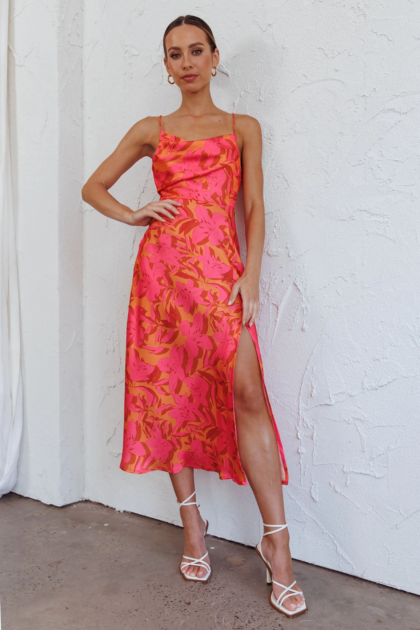 Make an entrance in our gorgeous Suki dress. Featuring a modest but classy silhouette with a sexy front split. We are in love with that cowl neckline and silky fabric. Perfect for a flirty first date teamed with nude, tie-up heels and a clutch.