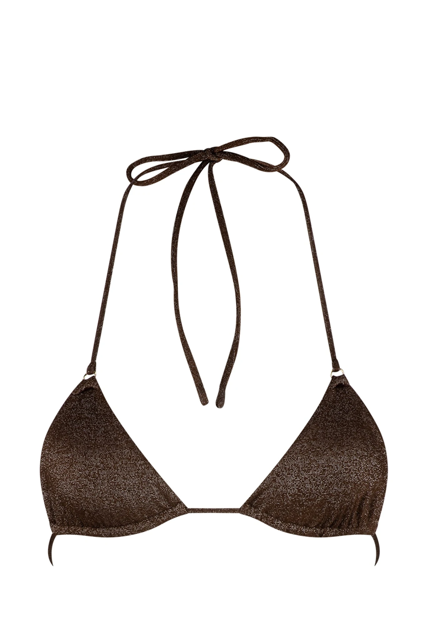 The Tula top by VDM is a reversible style that features a chocolate lurex sparkle on one side and a matte brown colorway on the other, as well as custom-designed gold rings connecting the straps to the bodice.